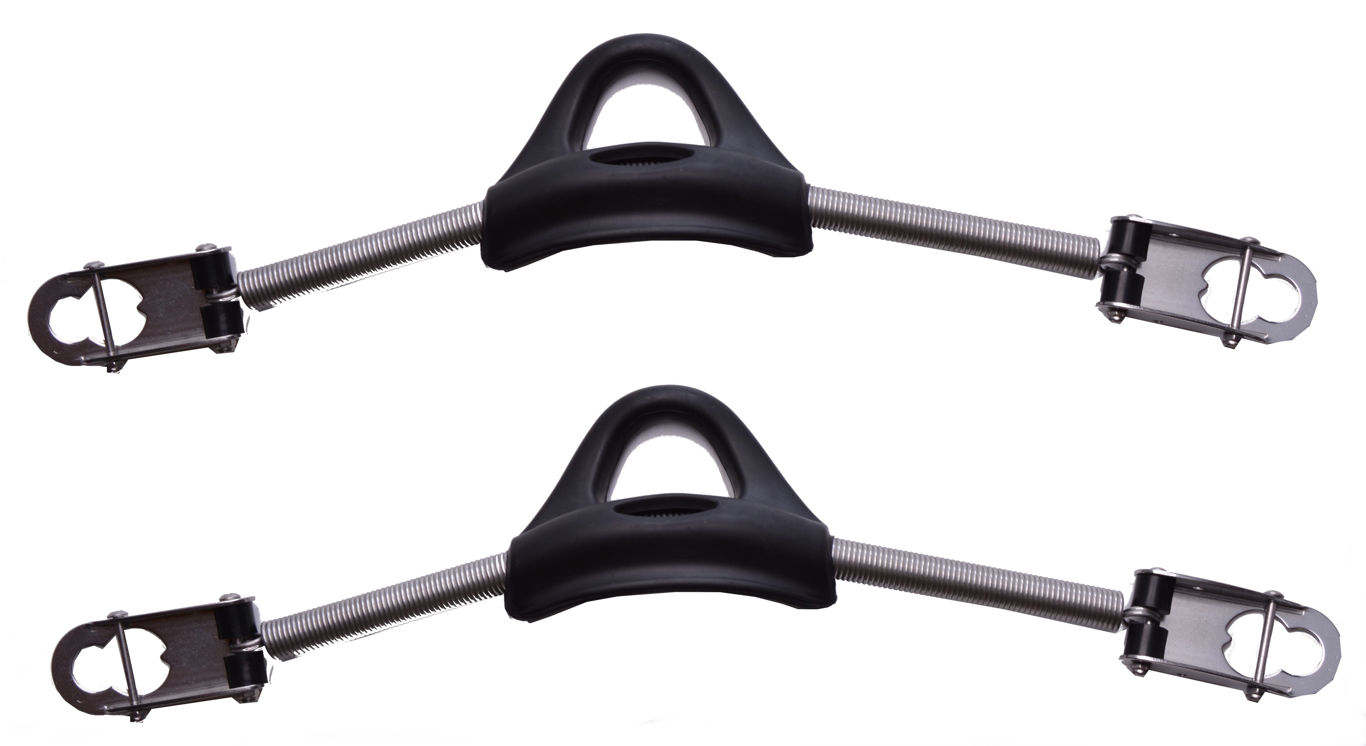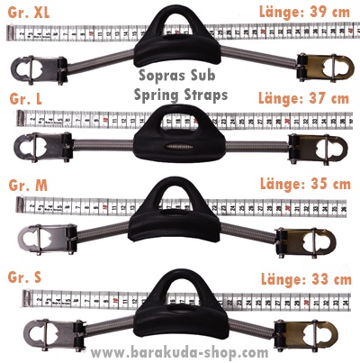 Sie passen auf alle gängigen Anschlüsse für Fersenbänder bei Geräte-Taucherflossen; sie werden in gewohnter Weise übergestülpt und mit einem Schraubsplint gesichert. Spring Straps verlieren Sie daher nicht und sind praktischerweise immer richtig eingestellt. Das breite Gummiteil im Fersenbereich verhindert das Verrutschen und bietet zugleich angenehmen Tragekomfort.